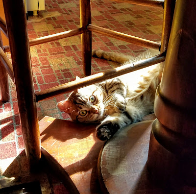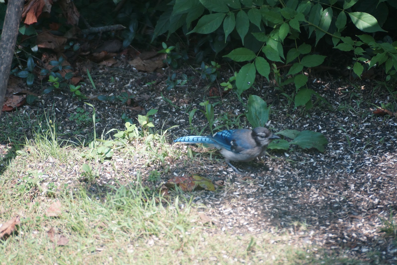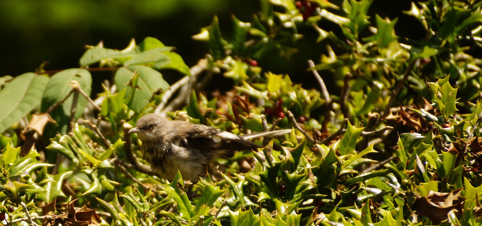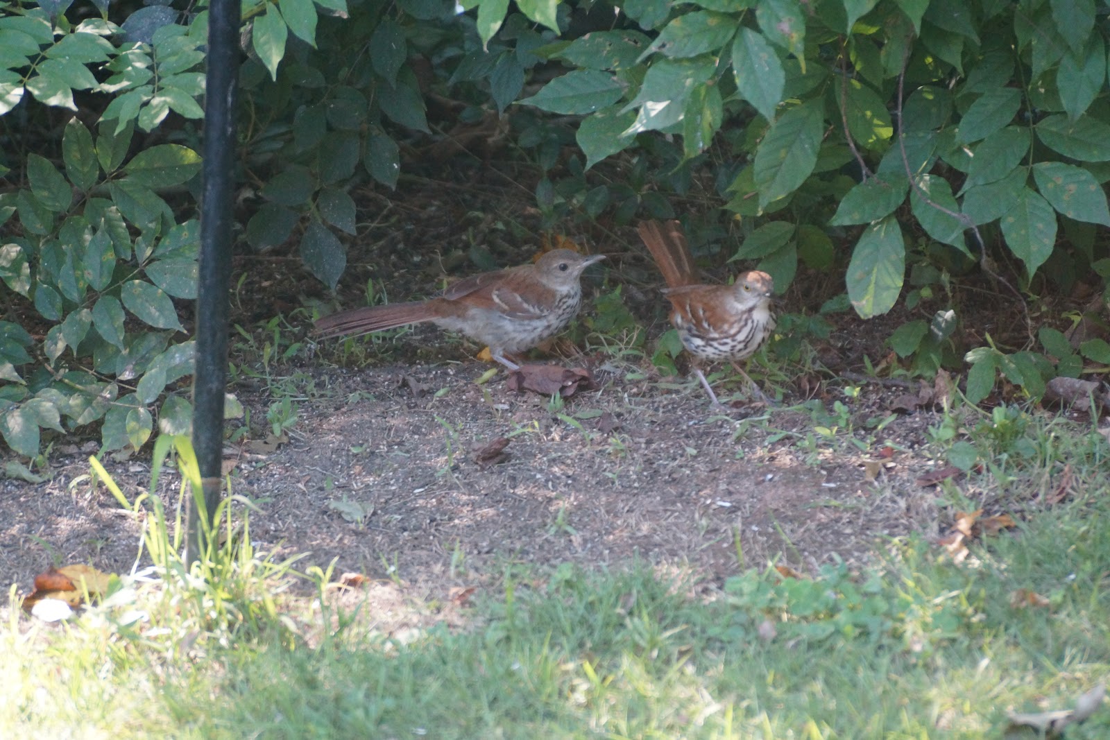 First were the mockingbirds. They raise two, and around here and on south three, broods a summer, so their first group was out early compared to the others.Their fledglings leave the nest very early, several weeks before they can fly (instead of days); their father feeds them while their mother broods the next set. They have very speckledy breasts and short tails and wings, and often spend time in bushes.