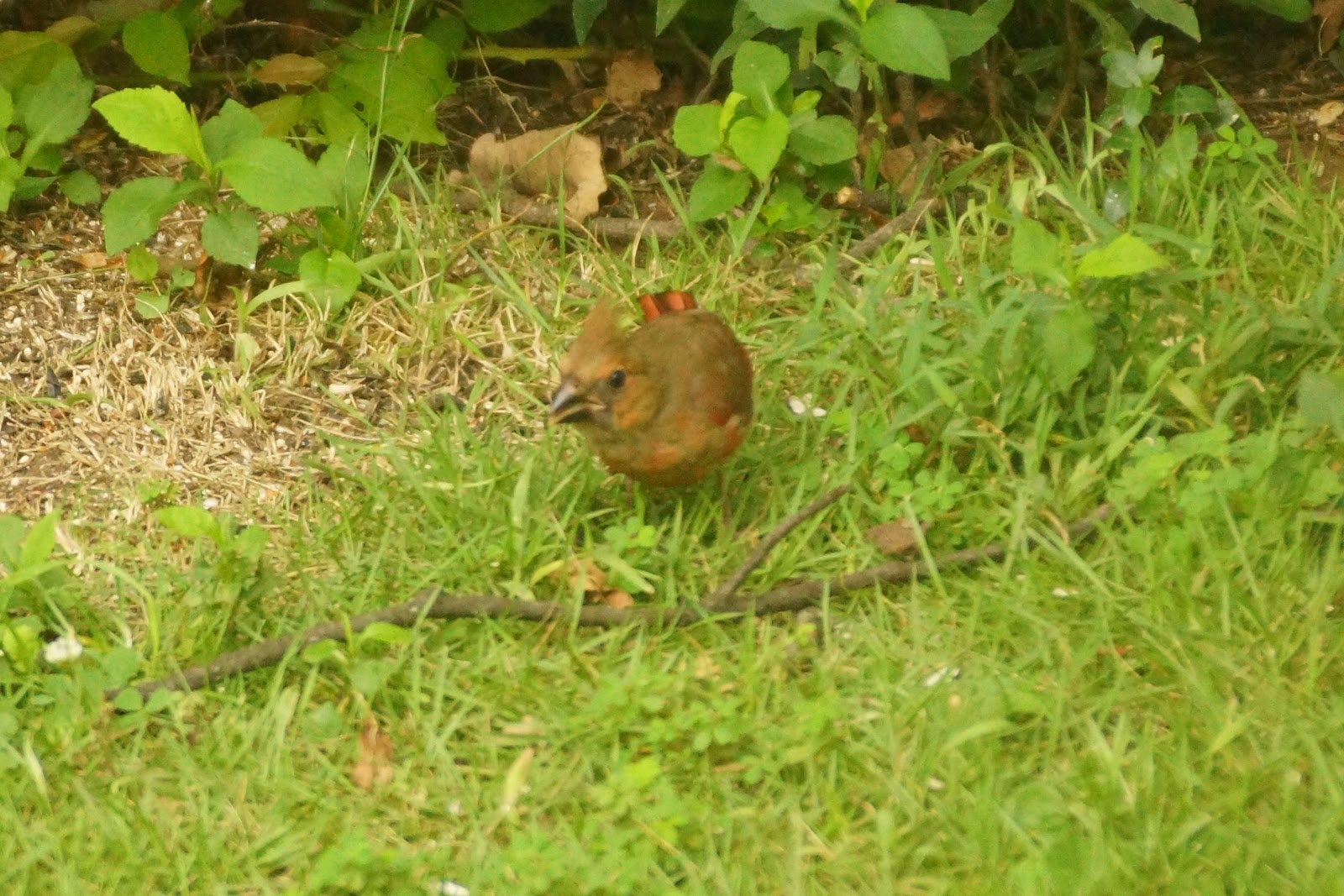 Young Northern cardinals are drab, usually with less red than adult females. Their bills are dark instead of orange.