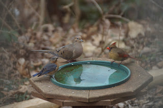 These Carolina wrens nested in one of my hanging baskets. Here the parents are feeding peanut pieces to one of their offspring.