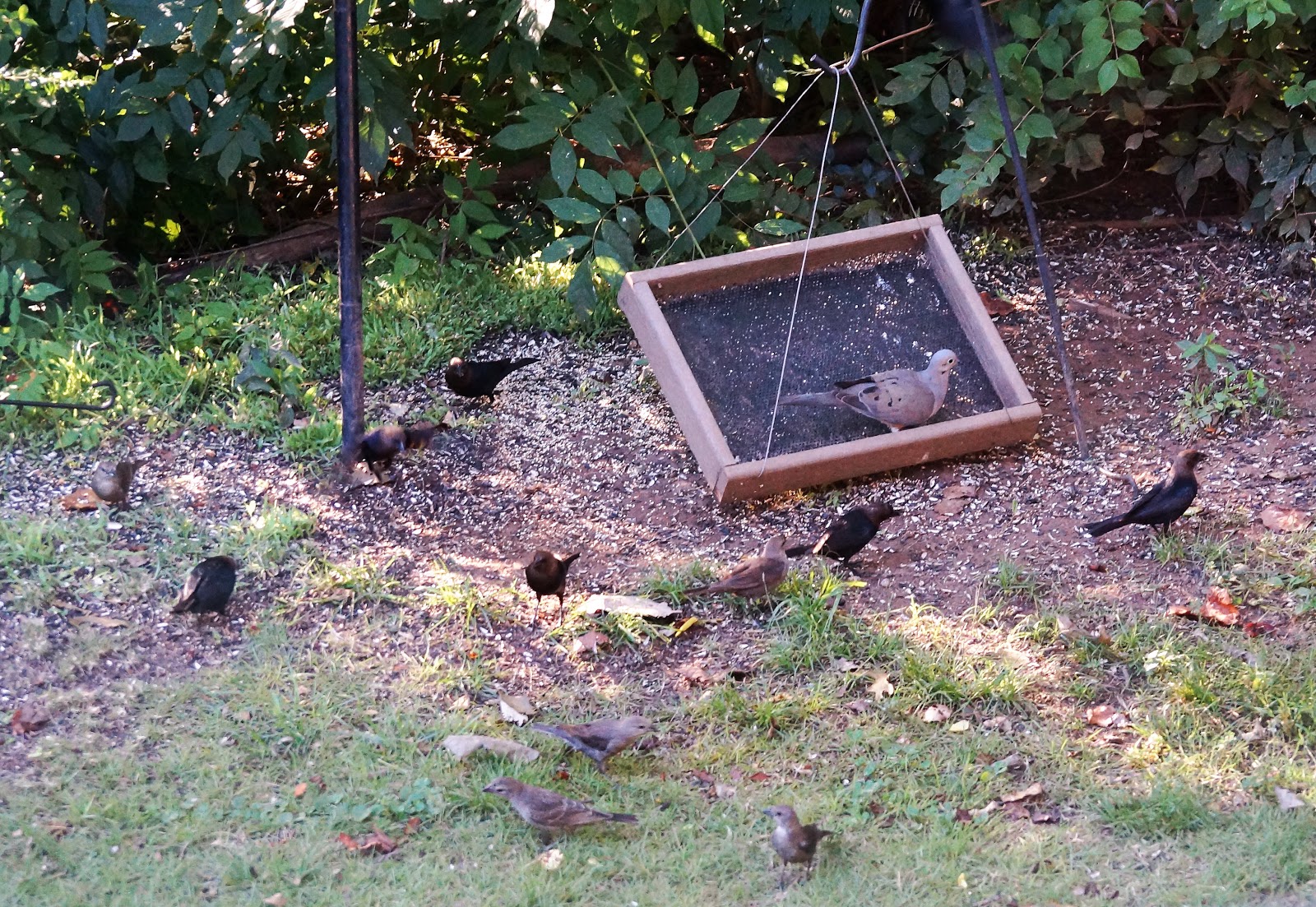 This is a flock of Brown-headed cowbirds, mostly males but with four females and one advanced juvenile who's left his foster parents to join his own kind. That's him, at the bottom looking left.