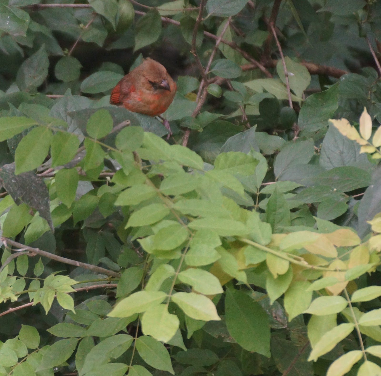 Broody teenage boy - his bill is almost orange and he's almost all red.